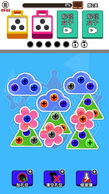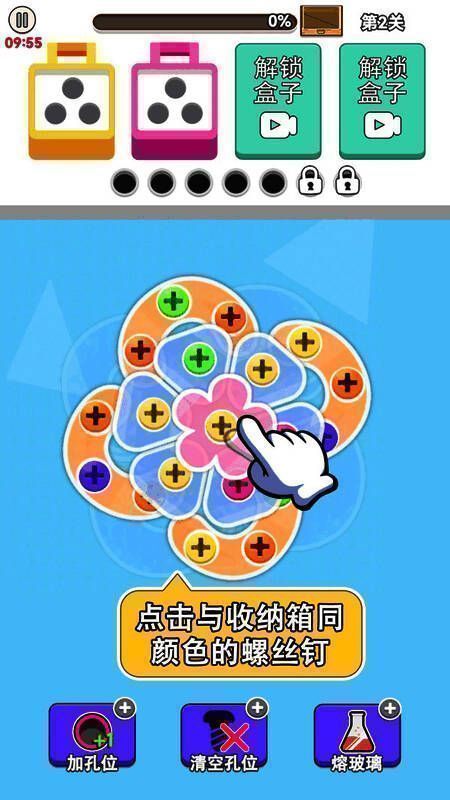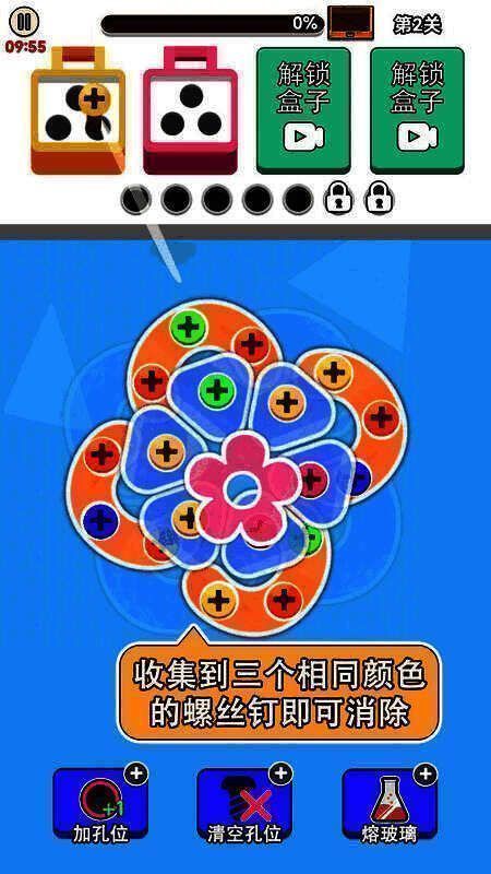 消除规则设计巧妙:收集三个同色螺丝即可触发清除效果,储物箱空间充足,降低资源焦虑。特殊道具如“漏洞清除器”可在关键时刻挽回失误,但需通关后奖励获取,激励玩家追求完美表现。金币作为核心资源,可用于解锁新工具或扩展储物空间,合理规划使用将大幅提升通关成功率。