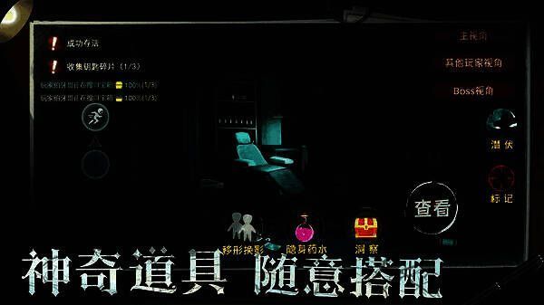 游戏采用1v4非对称竞技模式,1名追捕者(恐怖BOSS)对阵4名躲藏者,双方能力迥异,博弈感十足。追捕者拥有全图感知技能,可追踪躲藏者气息;躲藏者则需利用衣柜、草堆、道具箱等环境元素伪装自己,团队协作是生存关键。场景可交互设计大幅提升策略深度——打碎花瓶会触发警报,破坏家具可能暴露藏身点,每一次决策都关乎生死。