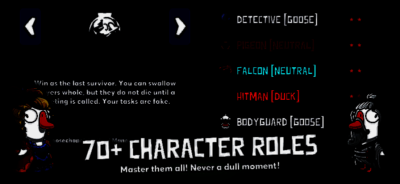 游戏的一大核心特色在于其庞大而丰富的角色系统。除了基础的“鹅”与“鸭”阵营外,还有众多拥有独特技能的中立角色,如猎鹰、秃鹫、呆呆鸟等,每个角色都有专属的获胜条件与操作策略,极大地拓展了游戏深度。