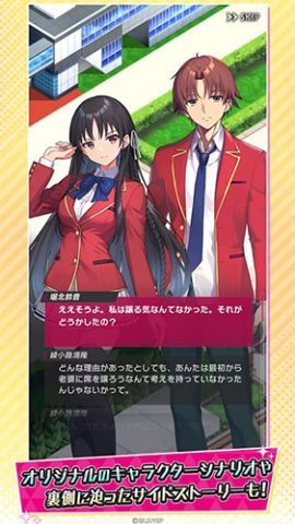 游戏高度还原《欢迎来到实力至上主义的教室》原著主线与支线剧情,关键情节如“无人岛考试”“体育祭对抗”“暗流涌动的投票战”均以互动对话形式呈现。玩家每一次选择都将影响角色好感度与班级积分,进而触发不同结局分支。值得注意的是,部分未在动画播出的原创互动剧情也将首次公开,需通过提升特定角色亲密度解锁,极大增强叙事纵深感与重复可玩性。
