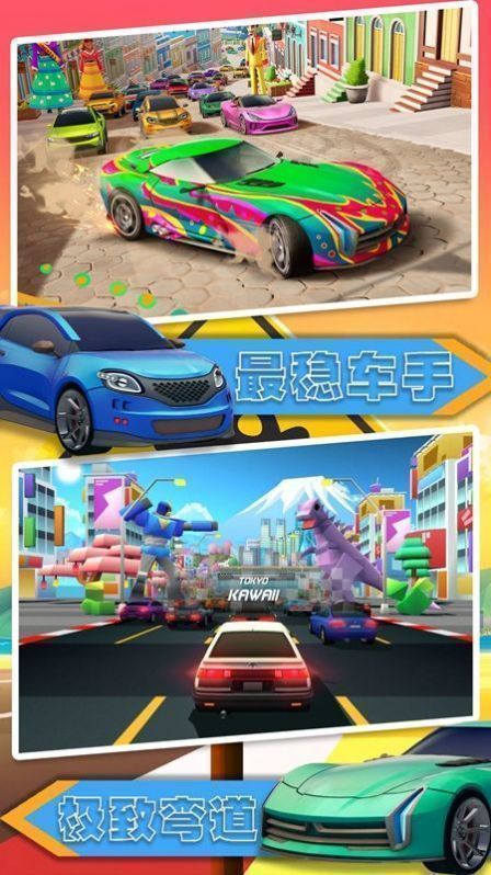 采用低多边形(Low-Poly)美术风格,搭配高饱和度色彩渲染,既保证移动端运行流畅性,又呈现出极具现代感的视觉冲击。动态天气系统引入晴天、雨雾等环境变量,湿滑路面显著影响操控难度,提升策略维度。