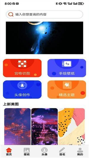 界面设计简洁直观,设有主页入口,方便用户快速浏览各类壁纸资源。操作流程简单明了,用户只需几步即可完成壁纸的搜索、预览与设置,真正实现“一键换装”。此外,软件还配备网格分割功能,允许用户根据个人审美对图片进行创意裁剪,提升使用趣味性。