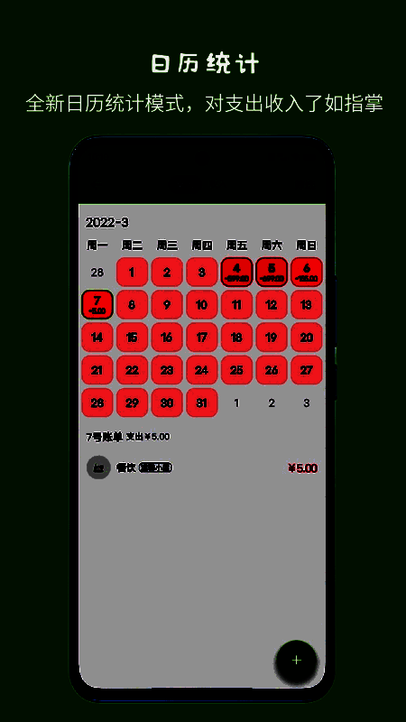 除了基础功能外,《小青账》还支持高度定制化服务。用户可以根据自身需求自由设置主要与次要支出类别,并通过日历模式查看每日详细开支。系统还会根据金额大小以颜色深浅进行区分,帮助识别高消费日期,从而更好地控制预算。