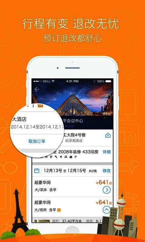 你定旅行软件界面展示,清晰显示酒店预订流程">