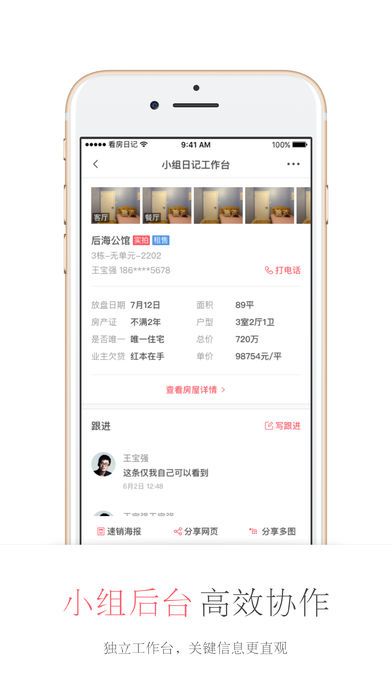 此外,看房日记的速效海报功能为楼盘展示提供了视觉营销支持,助力经纪人打造个人品牌,成为行业“颜值大V”;而在团队协作方面,软件提供小组功能,记录每一次房源修改与跟进动态,确保合作顺畅、信息透明。