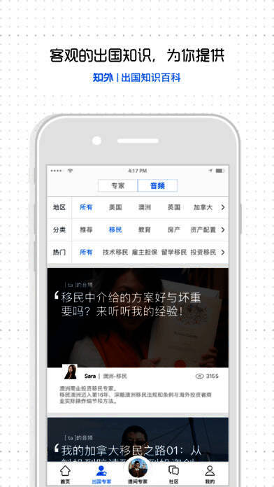 《知外》已邀请众多深耕全球留学、移民、海外房产及资产配置等领域的资深专家入驻平台,进行知识分享与在线答疑。这些来自一线行业的专业人士,将为你带来真实、可靠、有价值的出国建议。