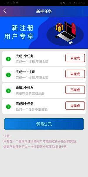 提现门槛低至3元,申请后预计24小时内到账,操作便捷无压力。用户还可以通过邀请好友参与任务,获得5元奖励,并享受好友提现金额的3%分成,邀请无上限,收益更可观。