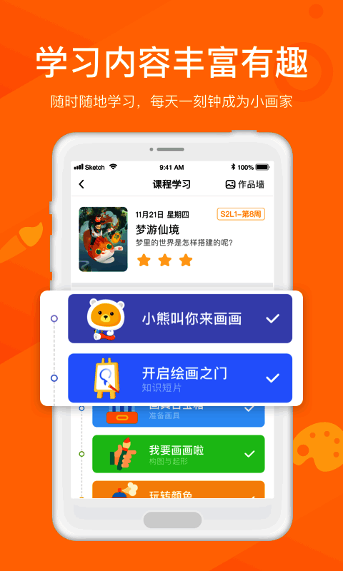 小熊美术拥有完整的课程结构,涵盖从基础涂鸦到创意绘画的多个阶段。每节课后都配有相应的练习任务,帮助孩子巩固所学内容。此外,系统还会自动生成个人作品集,记录每一次创作成果,便于回顾与成长追踪。