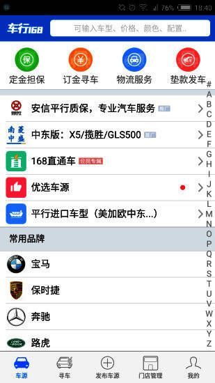 2、点击“车源”页面,查看推荐类型或通过字母索引查找车辆;