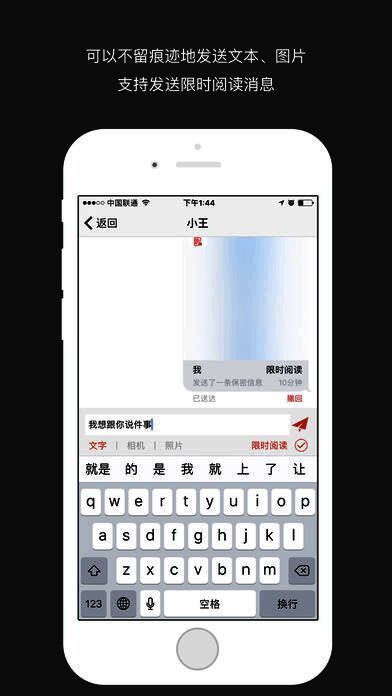 除了基础的加密与销毁机制,《密讯》还具备多项实用功能。例如“已阅状态”与“已阅通知”,让发送者清楚了解对方是否已查看消息;“限时阅读”设定为10分钟,超时则自动销毁;“撤回消息”功能允许用户在对方未读之前撤销发送内容。此外,它还支持iMessage及即时通信App的无缝对接,无需短信费用即可发送加密信息。