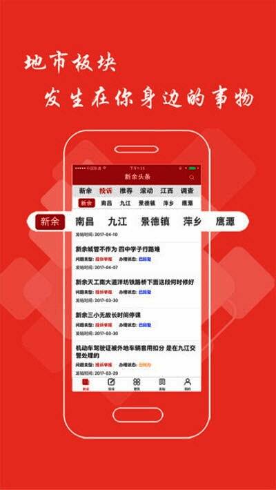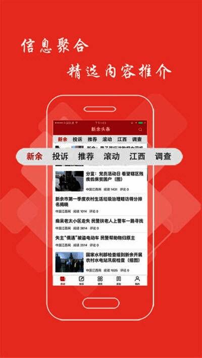 新余头条APP界面展示,清晰分类的新闻栏目与用户互动功能">