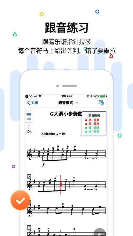 该软件的一大亮点是其高度智能化的操作逻辑:无需手动启动,只需依次拉响小提琴的四根空弦(E、A、D、G),即可自动开启练琴模式。在演奏过程中,应用会根据实际节奏自动翻页,并在演奏暂停六秒后自动停止,极大提升了使用便捷性。