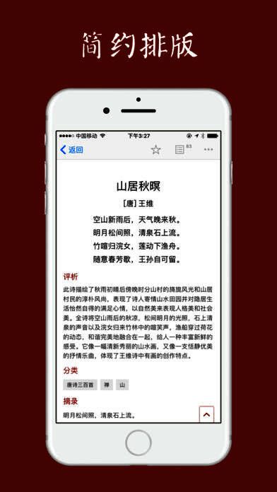 软件内设“一日一赏”功能,每天为用户推荐一首精选诗词,营造一个静谧而富有文化底蕴的阅读空间。此外,还提供多种分类赏析模块,包括爱情、孤独、田园等主题,以及节气、节日、自然景观等丰富内容,让古典诗词更贴近现代生活。