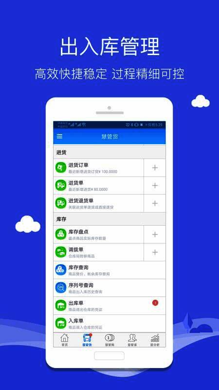 用户可通过简单的四步操作完成整个业务流程:下载安装后填写相关信息,进入首页选择所需功能;在“慧管货”模块中查看进货订单与库存状态,在“慧分析”界面则可获取详细的进货报表、销售报表以及整体经营状况。