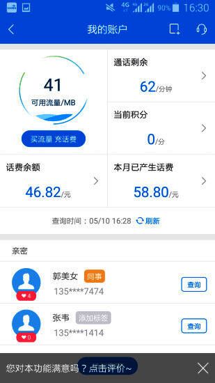 10086软件界面展示,清晰显示流量和话费信息">