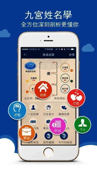 源自古代河图洛书之原理,全新开发台湾最热门的的九宫姓名学,从姓名看一生事业,工作,财运,感情婚姻,姻缘桃花,流年运势,男女配对合适度等。该用法不同于坊间的“宿命论”,而在于如何创造人生的价值,了解自己身上的优缺点、经过自我训练及调整,发挥与生俱来的优点、改变或隐藏缺点,并了解目前自己的运势轨道,积极运作,让自己借由经营、突破、改造来经营自己的人生,进而迈向成功,且不被“宿命论”所束搏。