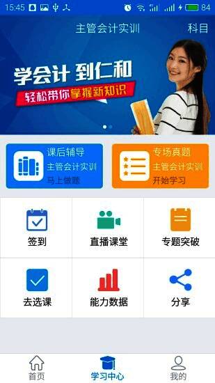1、仁和会计课堂主要由首页、学习中心、我的三部分组成;