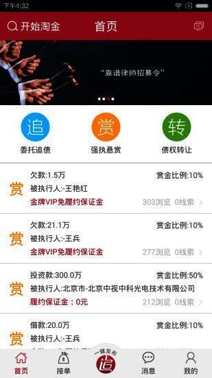 2、中国梦,法制梦人人追,诚信中国人人追,实现委托追债、强执悬赏、债权转让、即时互动、法律咨询等功能,解决收账难、执行难以及债权变现难等问题。