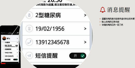 温馨的用药提示短信传递对亲友的关爱;贴心的用药记录功能;详细的用药日历一目了然;
