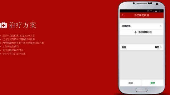 浏览与当前档案相关的治疗方案;已设定的药物可按提醒时间排序;内置提醒颜色有助于直观地管理治疗方案;从列表选取药物;设定医嘱和用药时间;设定个体化的治疗方案;