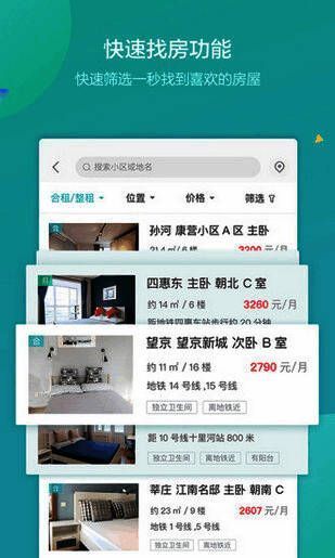 2、支持地铁、商圈、特色配置等筛选找房。