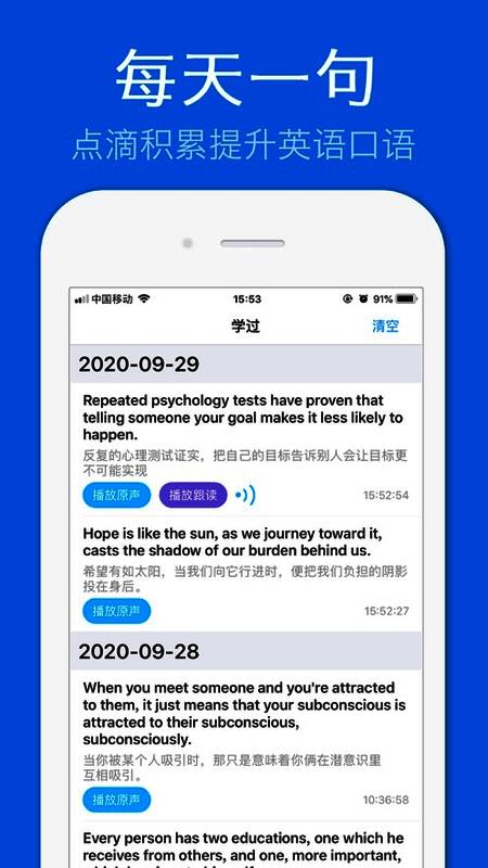 英语一句话APP是一个可以让大家每天都能轻松学英语的软件,每天都会为大家精选一句英语句子,配有真人发音,用户随时都可以播放跟读。可以通过这样的方式每天学英语,从点滴细节来积累,提升自己的英语口语能力。你可以给自己定制英语学习计划,结合自己的实际时间情况进行合理安排,可以固定一个时间来学习英语。
