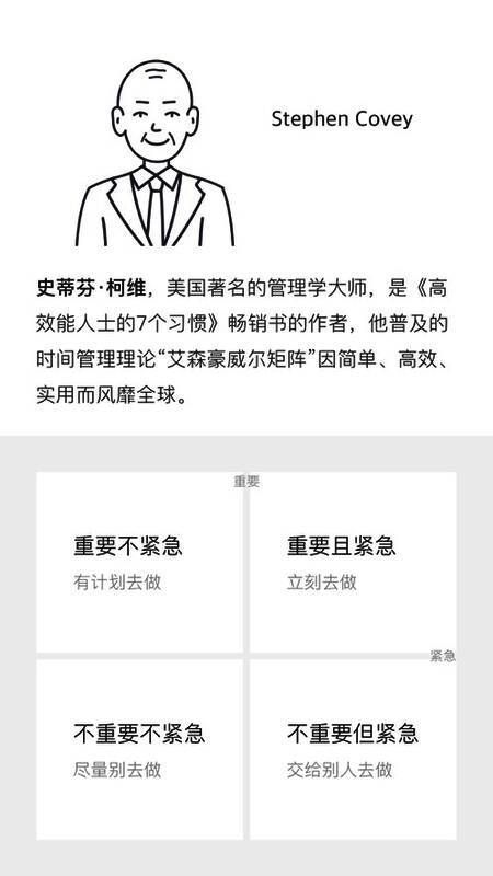 它是由著名的管理大师,畅销书《成功人士的7个习惯》的作者史蒂芬·柯维(Stephen Covey)提出的一个时间管理理论。该理论最重要的内容就是把事情按照重要和紧急程度划分为四个象限:重要而且紧急、重要但不紧急、不重要但紧急、不重要而且不紧急。