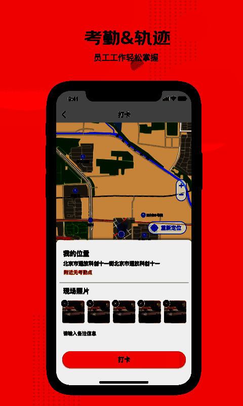 打卡考勤、工作轨迹实时记录,有效管理人员。