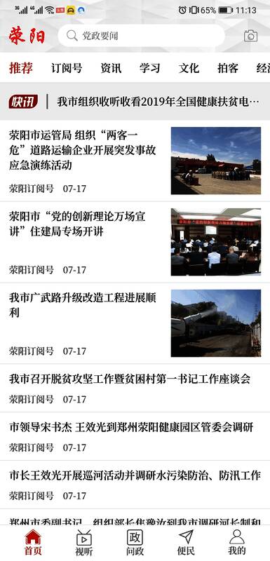 我看荥在这款APP上面是有和许多的新闻资讯是能够让你在上面阅读的,不管是河南本地的新闻资讯还是中国全世界的新闻资讯在上面是应有尽有的,还有着新闻每日头条也是能够让你在手机上面去进行阅读的,新闻资讯的首页当中还有着详细的新闻分类。在上面有着资讯、学习、文化、拍客、财经、头条、本地等等的分类这些都是可以按照你自己喜欢看的去进行选择的,还有着线上视频也是能够让你在视频当中去进行查看许多类型的视频以及新闻视频这些都是能够让你观看的。