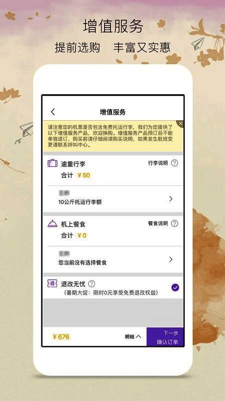 您可以根据行程需求订购托运行李、机上餐食、贵宾厅等增值服务,让您的行程轻松无忧。