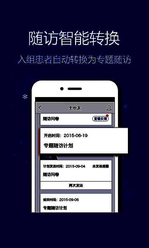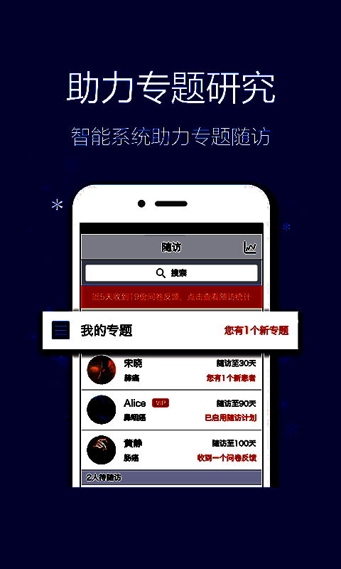 1、易随访:支持专题随访和常规随访,定期收集患者康复进展情况;