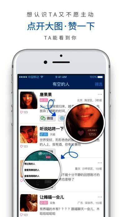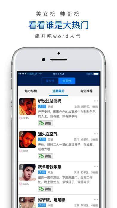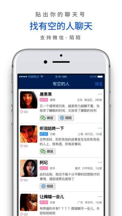 有空app是一款可以通过该软件看到微信,陌陌,连我上有空的人来找ta聊天的社交软件。在有空app你不但可以找有空的人聊天,还可以在自己有空想找人聊天的时候,贴出自己的微信账号,等人找你聊天。是不是很有趣?喜欢的小伙伴快来下载吧。