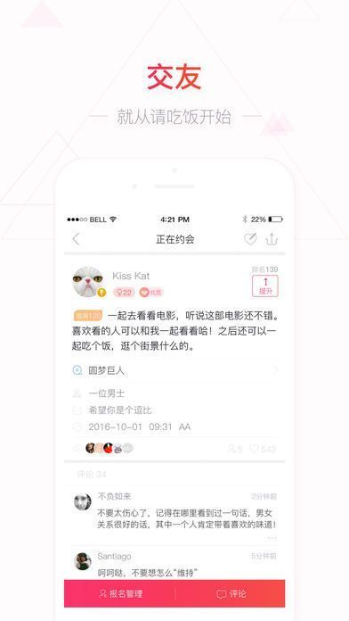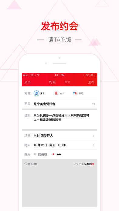 请吃饭,是一个快速线下交友平台。使用请吃饭,可以花费信用发布约会,也可以报名别人发起的约会,请吃饭将线上交友转移到线下,安全快速交友。