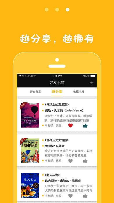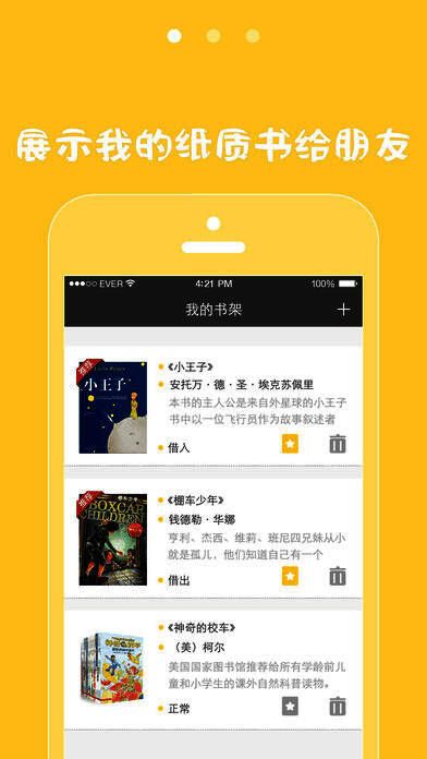 把自己的纸质书和朋友一起分享,越分享越拥有。能够看到朋友或附近的人有什么书,在读什么书,互相借阅吧。加好友或群,和别人一起讨论书籍,不再书荒。把这种分享图书的方法告诉朋友,创建大家的免费纸质图书馆。互相借阅,结交盆友,拓宽视野。通过ISBN条码扫描,把自己的书方便地管理起来,一目了然。