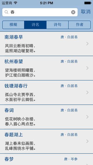 2、您可以方便的、快速的通过诗名、内容、作者等进行模糊查询,快速找到你想要的唐诗;