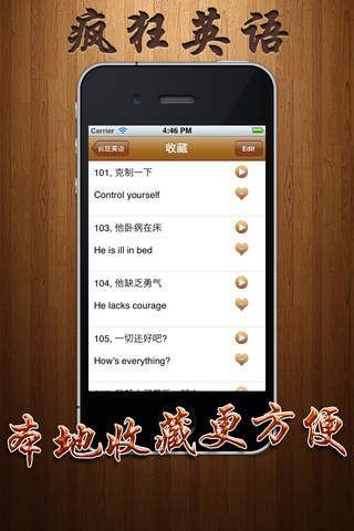 《疯狂英语》是一款专注于口语练习方面的英语学习软件,软件内置真人语音,大量日常生活用语,模拟真实口语环境,即学即用。软件支持本地收藏功能,方便用户使用学习,欢迎英语爱好者一起学习。