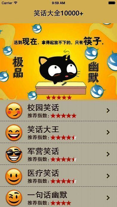《笑话大全10000+》专门收集最精彩的段子,活到现在,拿得起放不下的,只有筷子。《笑话大全10000+》目前已囊括了10000+精彩笑话,涵盖了极品幽默,雷人语录,校园笑话等众多类型的笑话,还有更多笑话陆续收录中。