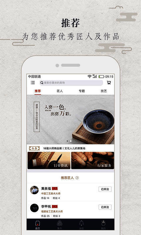 华夏匠人是集传承、交流、交易及传播为一体的手工艺文化生态平台,将互联网与传统手工艺产业创新有机的融合发展,推进手工艺产业的发展。
