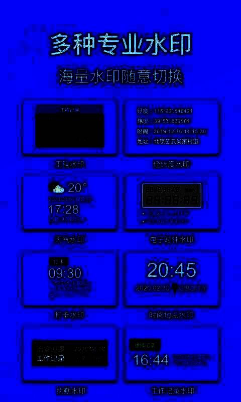 打卡相机是一款为用户提供各种拍照技能的应用软件,它是一款自定义水印相机。用户可以使用这个软件拍照、拍视频等,可以在使用APP在照片和视频上添加水印,防止图片被盗,为用户提供了很多便利;也可以在拍照时直接设置水印,有时间地点水印、天气水印、经纬度水印、电子时钟水印、工程水印、旅行水银等各种水印模式,用户可以根据自己的需要选择相应的水印;打开时没有广告,很快就进入页面上,直接使用,非常方便;可以将自己拍的视频和照片一键分享到社交软件上,吸引别人来观看。