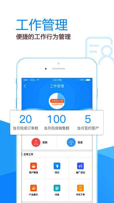 【工作管理】通过工作管理可以帮你记录工作的每一个行为。地图定位,为经销商提供了绑定关系的位置分布,更精准的分析当前销售区域的空缺;收、发货统计,为零售商提供了精准的数据统计,更明确的分析每款产品的销售额统计;签到、推广活动、客户管理、拜访+行车记录、问卷每个功能为一线工作人员的每个工作细节提供了更贴心的记录,便捷了统计记录,方便的行为管理;