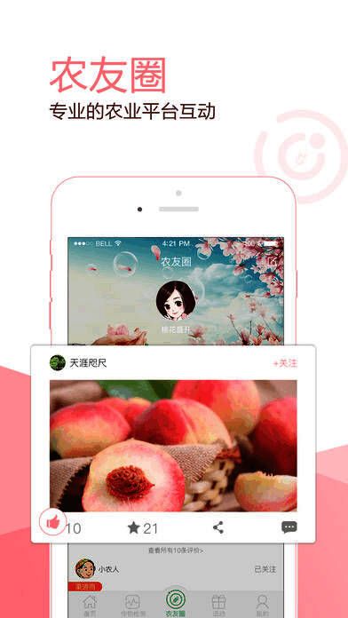 【农友圈】专门为农业爱好者打造的互动沟通的平台。通过这个平台您可以秀出您的田地,可以发出您的买卖需求,更是您收获朋友的地方;