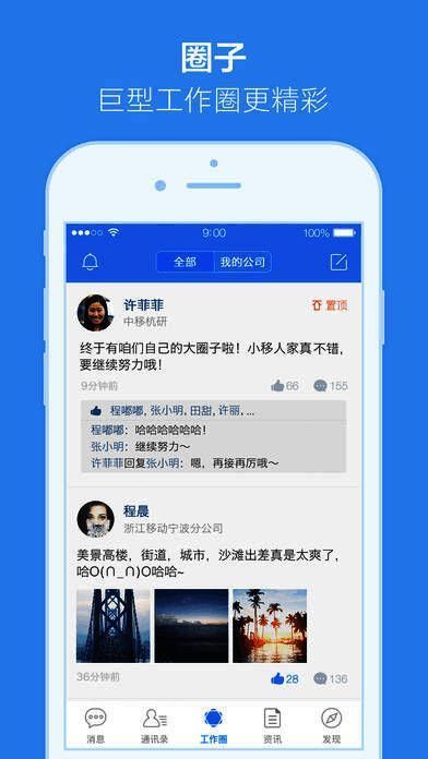 与全体员工分享工作动态、生活见闻;