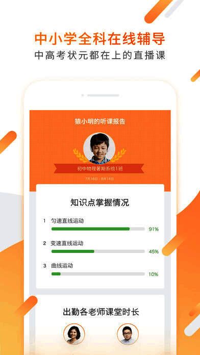 猿辅导是针对小学、初中、高中全科(语文、数学、英语、物理、化学等)的在线辅导软件,高效提分利器!足不出户在家挑选北京名师,直播互动随选随学,迄今已有116万中小学生选择了在猿辅导上直播课。