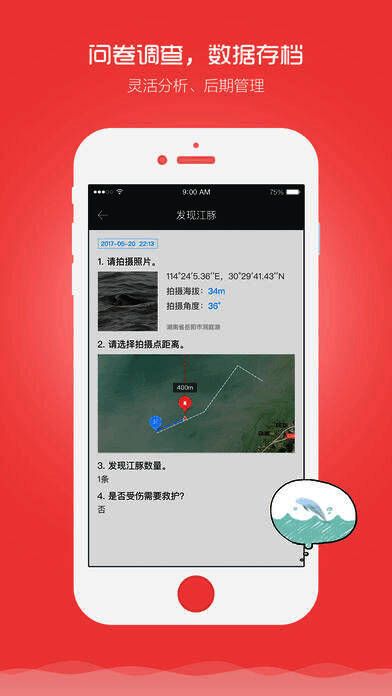 江豚管家作为专业协助巡护的手机应用,这款应用将自动记录巡护航行的轨迹,半自动记录发现受伤江豚、非法渔业等事件,也可以通过手机看到护渔员是否在工作,并随时进行电子记录。