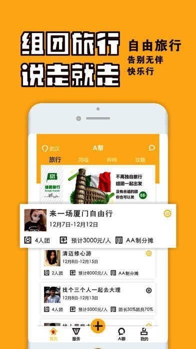 1、旅行帮:组团旅行,用户可发起或参加多人自由旅行团;