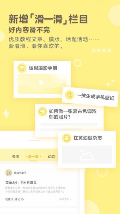 1、新增「滑一滑」栏目:优质教程文章、模板、话题活动……滑滑滑,滑你喜欢的;