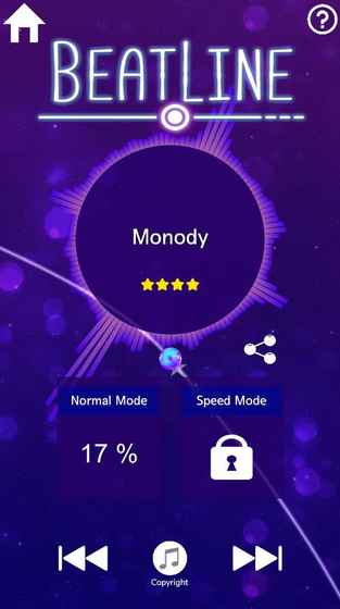 游戏操作十分简单,点击屏幕的左右处可以让游走于钢丝之中的小球移动至屏幕两侧,从而顺利避开路上的障碍,而当遇到黄色的光点时则需要玩家控制小球与其产生接触,配合音乐的旋律能够更为轻松通过难关。