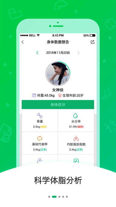 1、智能体脂测量 指标精准展现:通过智能硬件+APP形式,精准测量12项身体指标,清晰精准展现,管理专业方便;