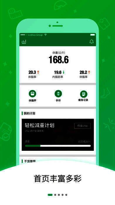 2、业方案指导 科学搭配瘦身:结合体脂秤数据,量身制定体重管理方案,每日饮食、运动计划随手记,瘦身高效又便捷;