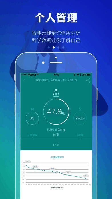云悦智能体质分析仪能方便的测量和管理你和家人身体的各项数据,并能根据数据指定健康轻体计划。还能为你和家人提供个性化的运动、饮食和睡眠建议。体质仪会根据测量分析有关健康的事项基本数据:体重、BMI、体脂率、皮下脂肪、骨骼重量、肌肉比例、水含量、基础代谢率、内脏脂肪、身体年龄这十项数据,更懂您的健康。